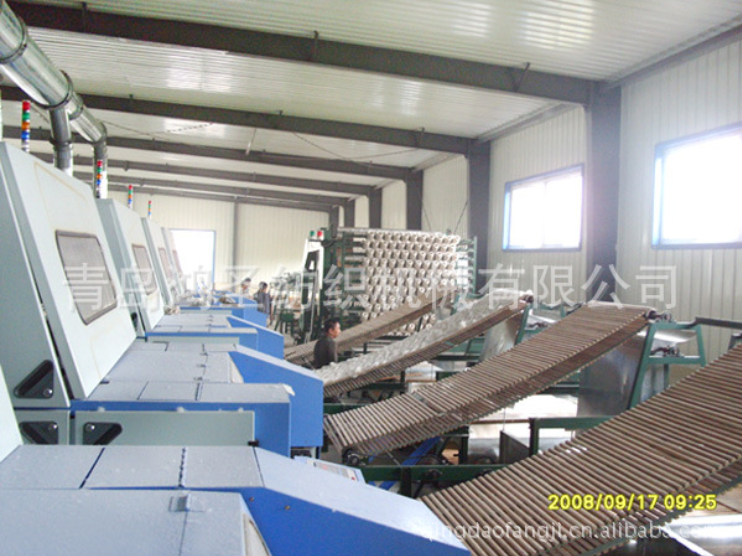蠶絲被生產線工藝流程:開送棉機-梳棉機(梳理機)-鋪網機-針刺機-拉斷機(切斷機)-自動裝套機。性能參數:大成型尺寸: 2600×2400mm有效門幅: 2700mm適用纖維: 滌淪、羊毛等產品用途: 絎縫被、軟床墊等非織造布前道設備生產能力:120條/小時